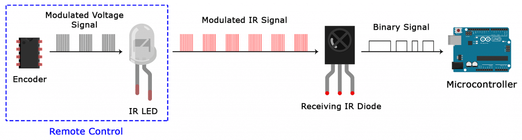Dalam modulasi sinyal IR, encoder pada remote IR mengubah sinyal biner menjadi sinyal listrik termodulasi. Sinyal listrik ini dikirim ke LED transmisi. Transmisi LED mengubah sinyal listrik termodulasi menjadi sinyal cahaya IR termodulasi. Penerima IR kemudian mendemodulasi sinyal cahaya IR dan mengubahnya kembali menjadi biner sebelum meneruskan informasi ke mikrokontroler: