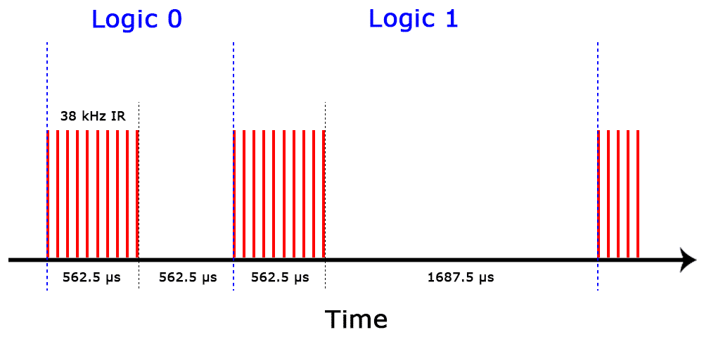 Logika ‘1’ dimulai dengan pulsa HIGH panjang 562,5 s dari 38 kHz IR diikuti oleh pulsa LOW panjang 1,687,5 s. Logika ‘0’ ditransmisikan dengan pulsa HIGH panjang 562,5 s diikuti oleh pulsa LOW 562,5 s: