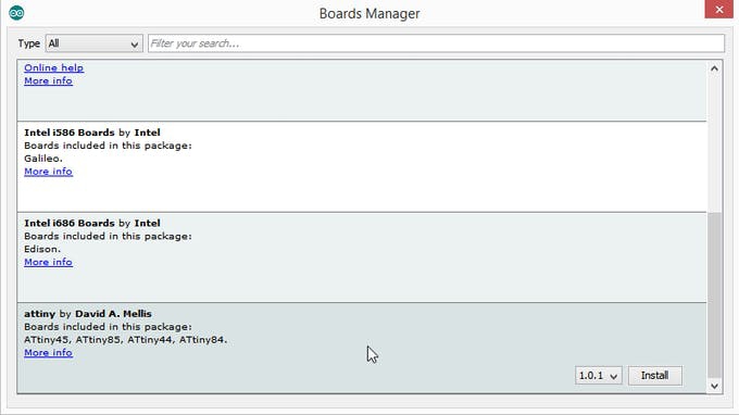 Setelah membuka Board Manager, cari ke bawah daftar yang bertuliskan “attiny by Davis A. Mellis“. Klik itu dan instal.