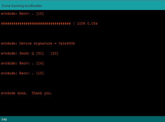 Anda akan mendapatkan informasi seperti di atas jika burning bootloader berhasil.