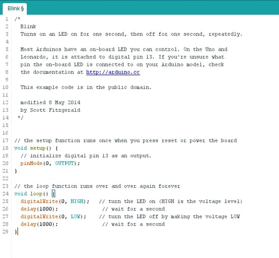 Sekarang buka contoh Blink dari contoh arduino dan ubah nomor pin dari 13 menjadi 0 dan unggah.